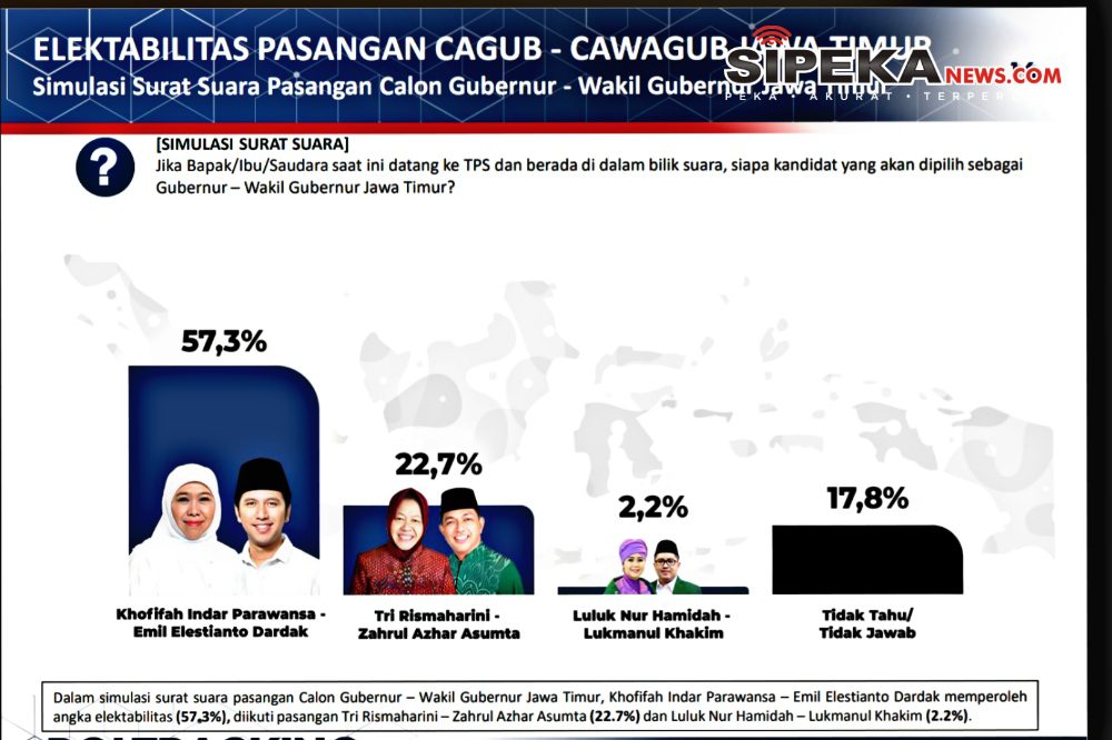 Pada simulasi pasangan calon, Khofifah-Indar Parawansa dan Emil Elestianto Dardak kembali mendominasi dengan angka elektabilitas 57.3%. Pasangan ini unggul jauh dari pasangan Tri Rismaharini-Zahrul Azhar Asumta yang memperoleh 22.7%, sementara pasangan Luluk Nur Hamidah-Lukmanul Khakim hanya meraih 2.2%. Keunggulan pasangan Khofifah-Emil ini tampaknya dipengaruhi oleh popularitas program-program pemerintahan mereka, seperti Jatim Sejahtera dan Jatim Kerja, yang mendapat apresiasi luas dari masyarakat.
